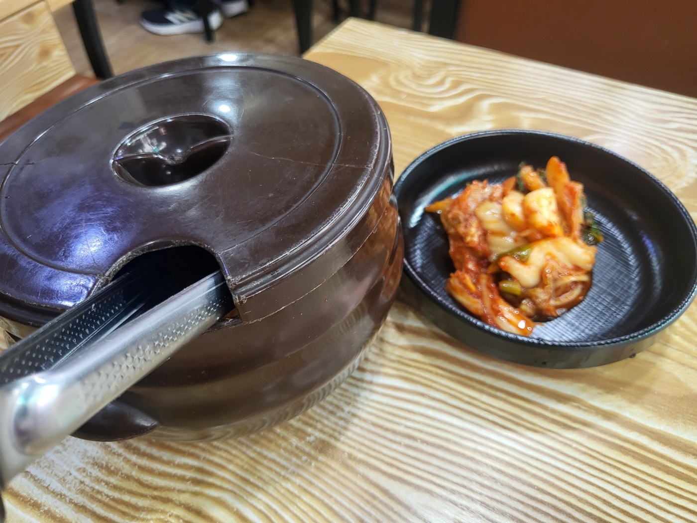 테이블에는 집게가 꽂혀 있는 김치 항아리와